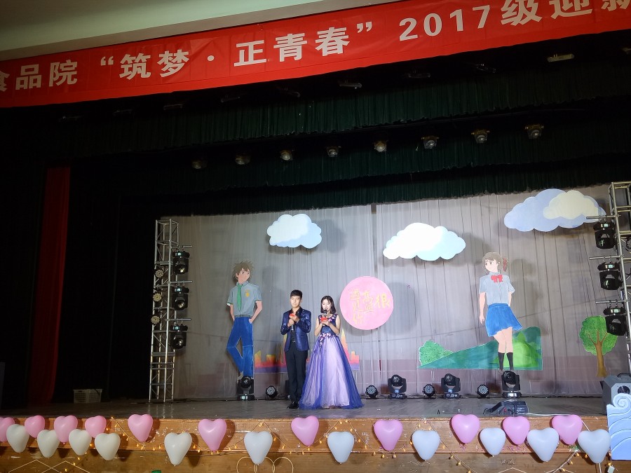 为迎接2017级新生的到来,展现我食品科学与工程学院莘莘学子的风采,11月3日晚七点,由学生会文艺部主办的“筑梦正青春”迎新晚会在校大礼堂炫目起航。到场嘉宾有我院党委副书记胡丹、团委书记万旻轩和2017级各班班主任。